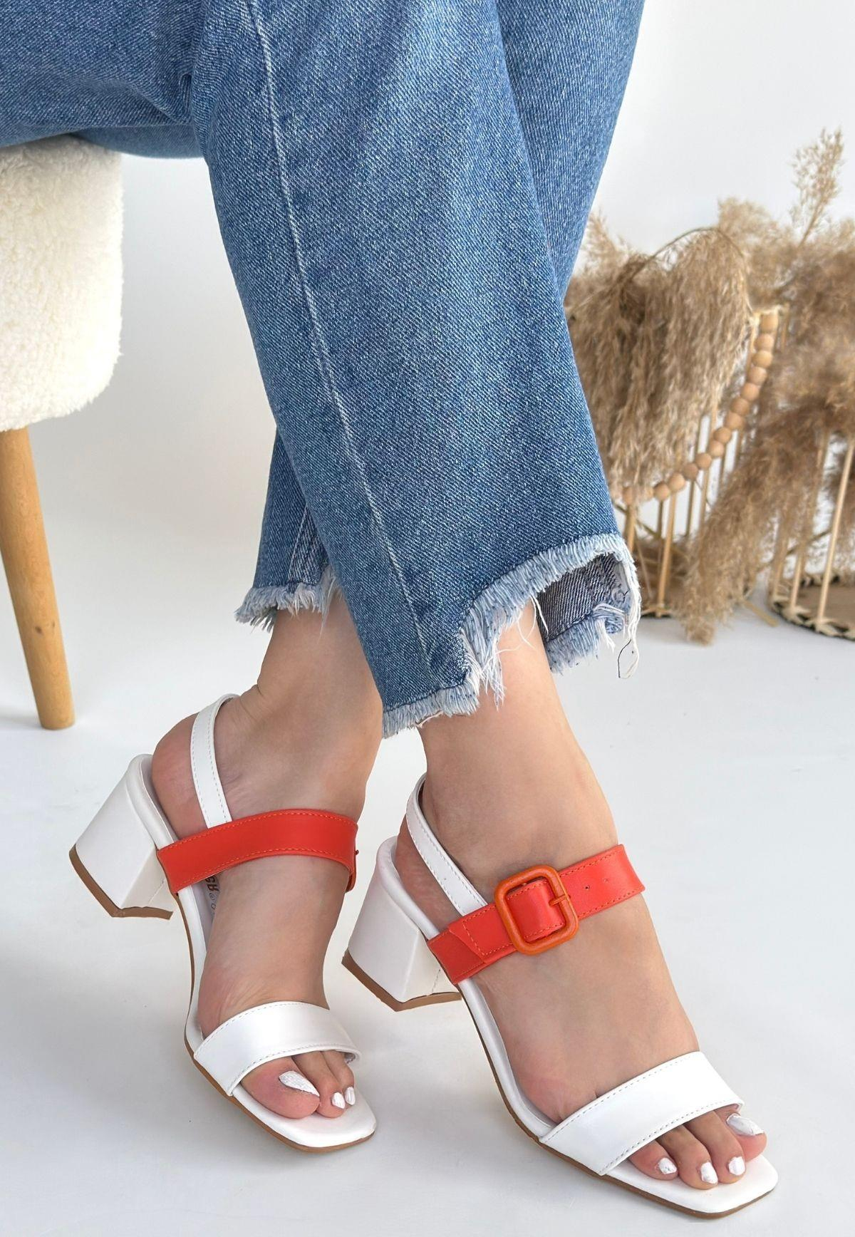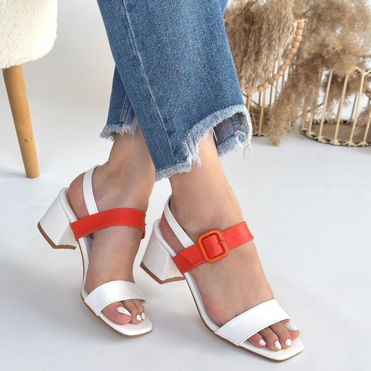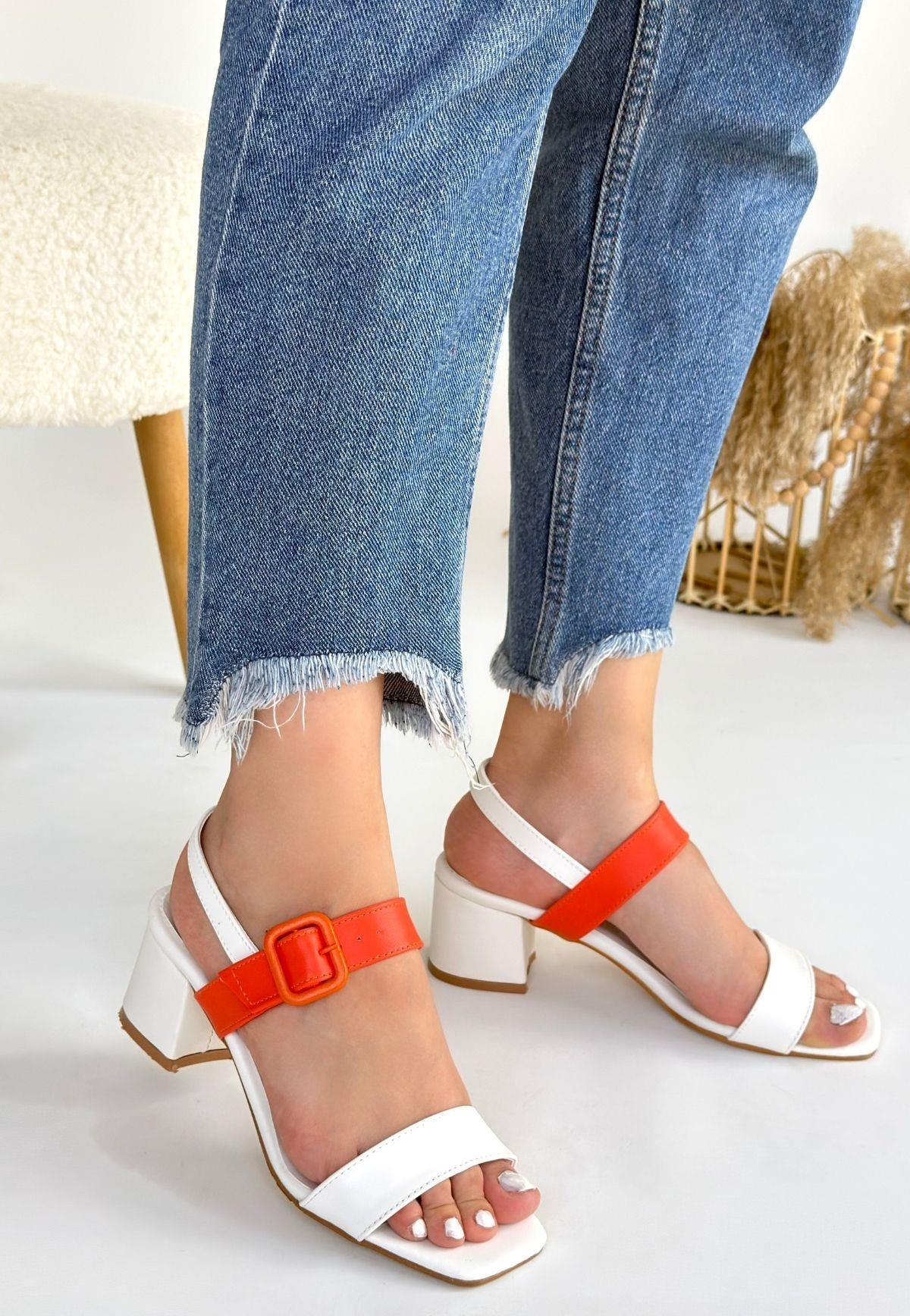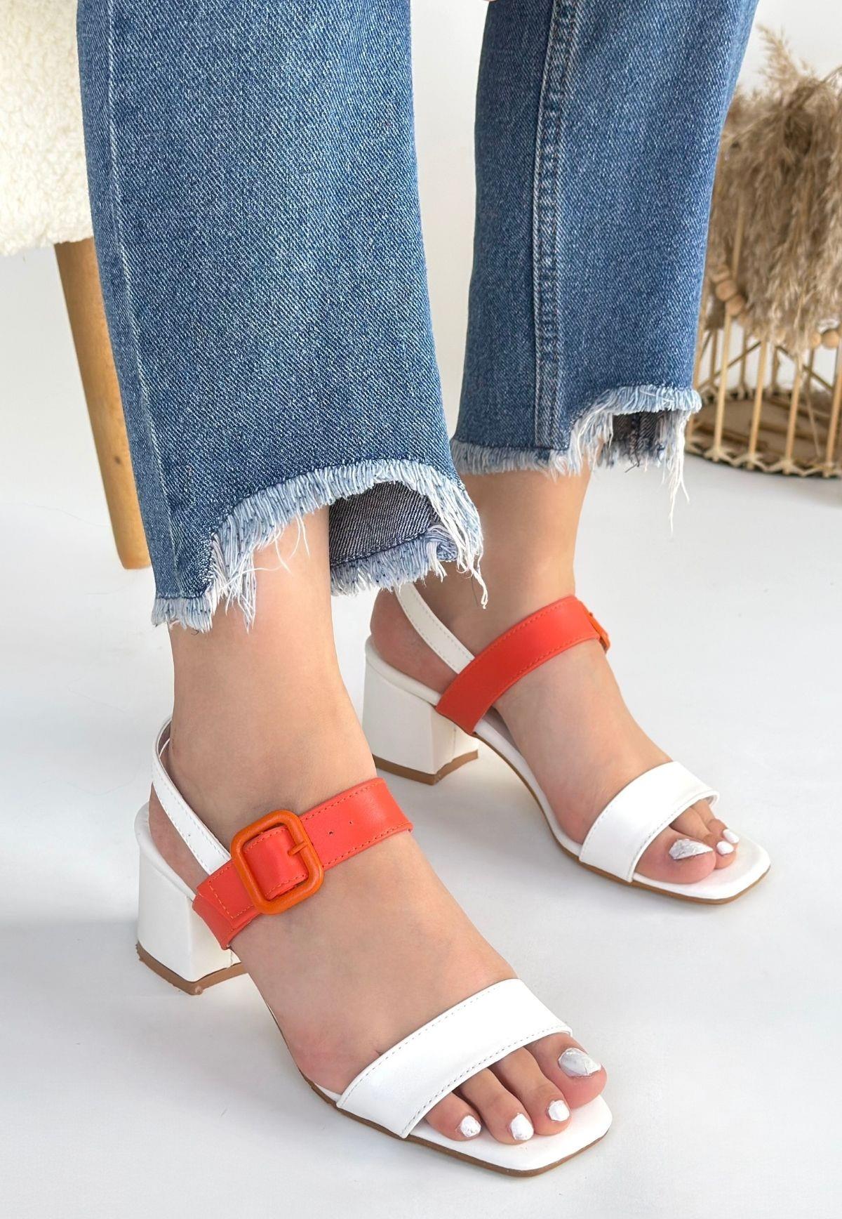 Year Beyaz Cilt Turuncu Detaylı Beyaz Topuklu Ayakkabı (ILK-KDN-KTP-262661)